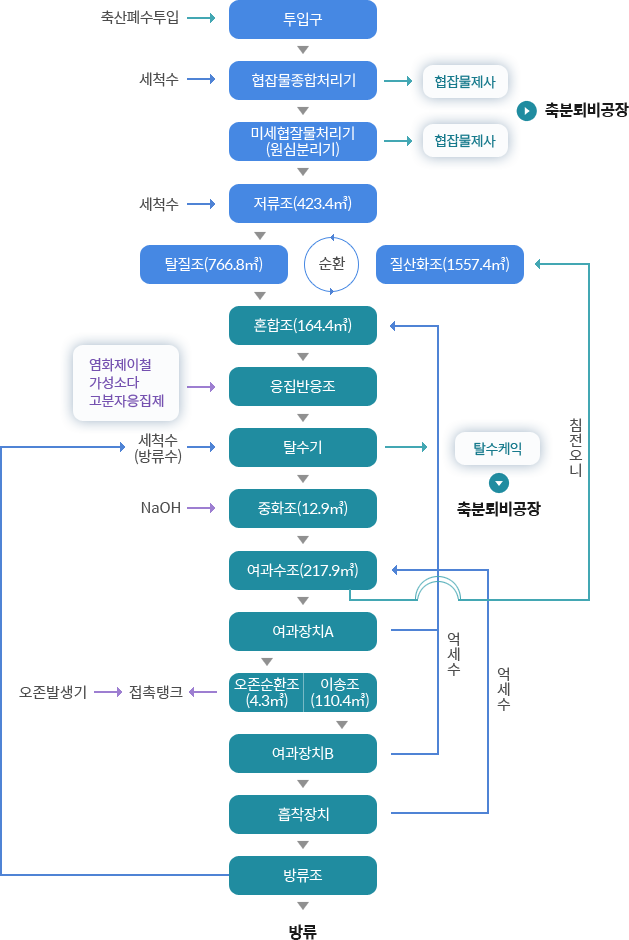 단독처리 | 물리적처리(종합협잡물처리기 + 원심분리기) | 액상부식법(생물학적처리) | 응집 + 탈수(화학, 물리적) | 여과장치+오존접촉+활성탄여과 |