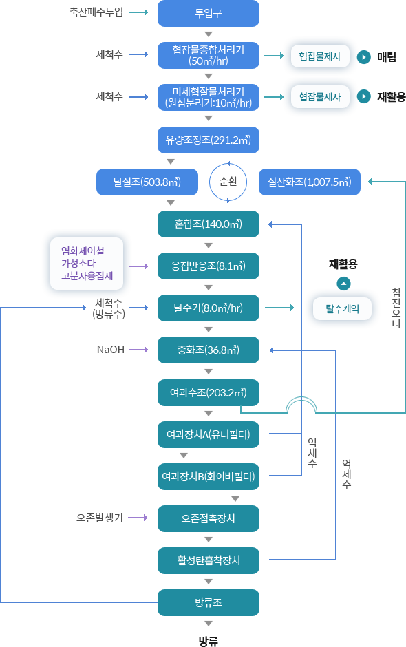 단독처리 | 물리적처리 | 액상부식법(생물학적처리) | 응집 + 탈수 | 여과장치+ 오존접촉+ 활성탄여과 |